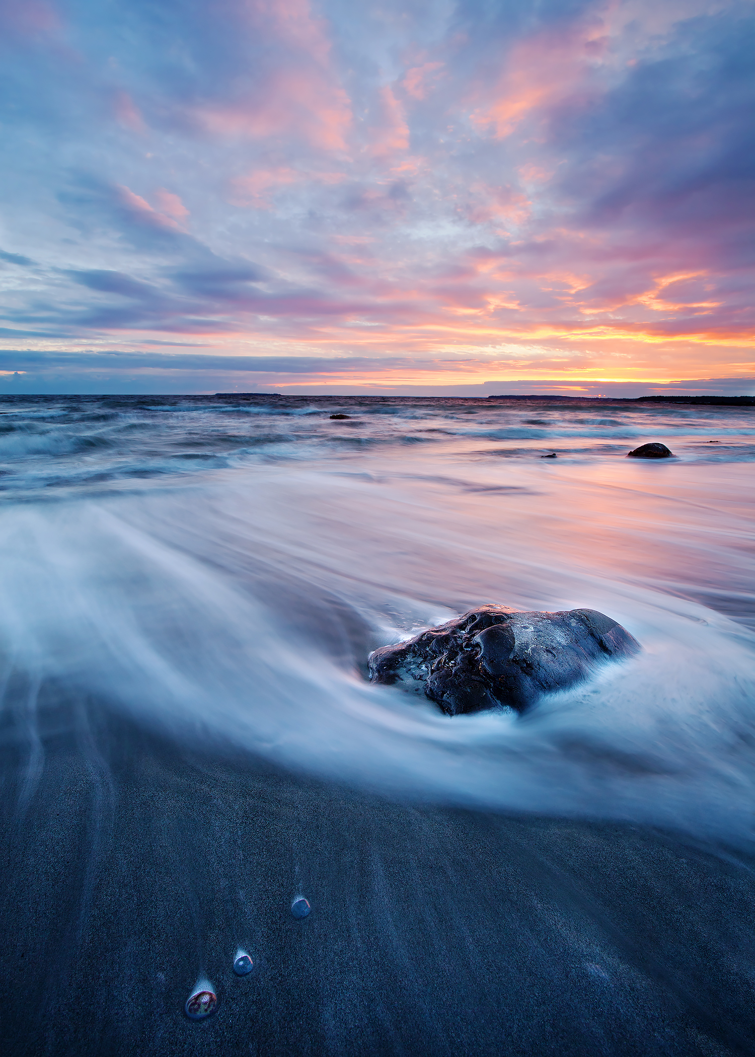 Landscapes; Depending on the light you may be able to capture some great landscape images. Below you’ll see an image that has great sunset color with a slow exposure to make the water look milky, an image of waves crashing with light peeking through the clouds, and an image that is an ICM (intentional camera movement) slow shutter speed pan of the ocean and distant islands. Create an image that suits the conditions.