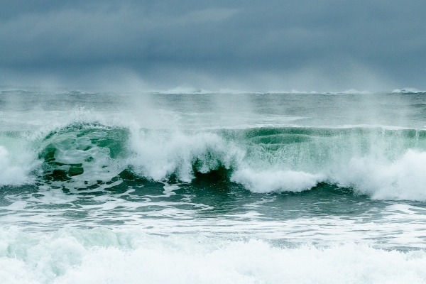 Waves; Depending on the weather conditions you may be in luck to capture some wave action. Below shows an overcast windy day with a pretty good surf. In the image below the wind was coming offshore so as the wave was ready to crash the wind was creating spray blowing back from the top of the wave.