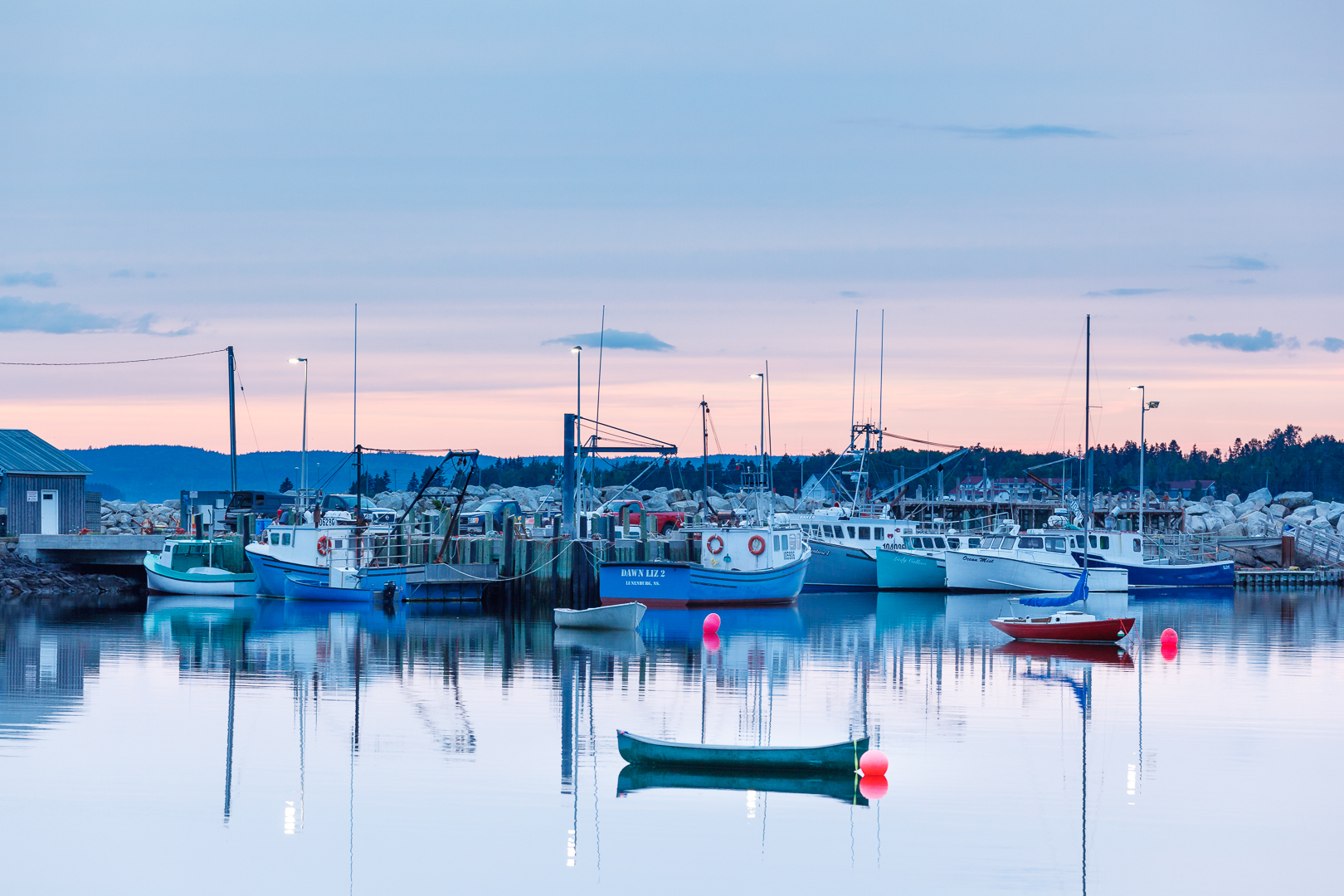 The Blue Hour; Not only finding blue subjects but shooting them during the blue hour can create solid images as well. This image is a bit busy but there is the rule of odds (three blue boats), reflections due to the calm water, and the pink sky providing a contrast in colour to the image.