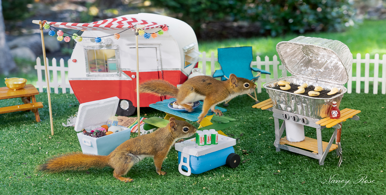 Nancy worked as a Guidance Counselor and Family Studies teacher until she retired in 2016. Nancy grew up in Antigonish, NS, in a family of seven children where creativity was always encouraged and over the years she has pursued a variety of art and craft endeavors in her spare time. She started taking photography seriously in 2007 when she joined Flickr.com where she was inspired by the creativity and talents of photographers from all over the world. Her interest in nature and wildlife, and a storage room full of fabrics, paint, clay and craft materials merged with her photography passion when she discovered the curiosity of the little North American Red Squirrels who raided the bird feeders in her backyard. By making miniature dioramas and squirrel-size props she has created hundreds of scenarios where the inquisitive squirrels find themselves in some rather human-like poses as they search for peanuts hidden in the props. Gradually, the “secret life” of her backyard squirrels emerged. Her first “actor”, Mr. Peanuts, has been followed by a succession of cute and curious squirrels who come daily for peanuts and sunflower seeds and to check out whatever Nancy puts out on the table on her deck. Sometimes she gets a good shot right away, but more often it takes hundreds of photos to get a clearly focused shot that tells the story Nancy has in her head.