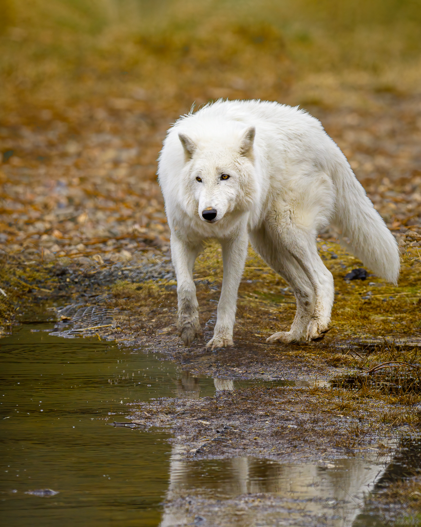 The image of the Arctic Wolf with the reflection was taken with a longer focal length and composed tightly to remove the fence for the left of the Wolf, however the background was his wooden den and as a result I replaced the background using Photoshop.