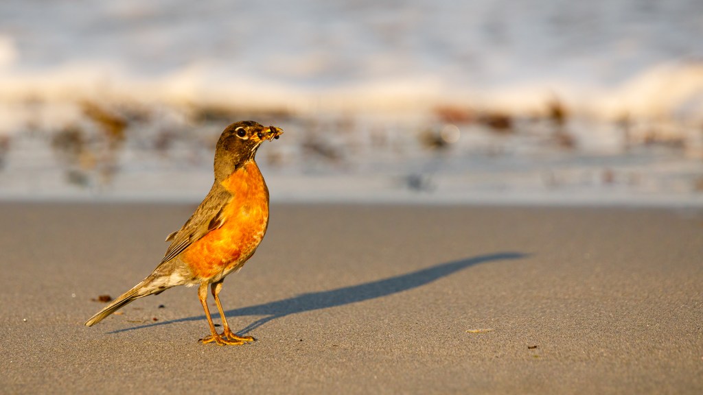 We don’t see American Robin’s very often at the beach close by where we live unless there is some seaweed on the sand where they can forage for insects. In the golden hour light it enhances the rusty red colour of the Robin’s breast feathers and also casts a long shadow which enhances the dimension of the bird. The background slight blue colour of the water is a complementary colour to the bird and the warm sand colour so the background also blends in well with this image.