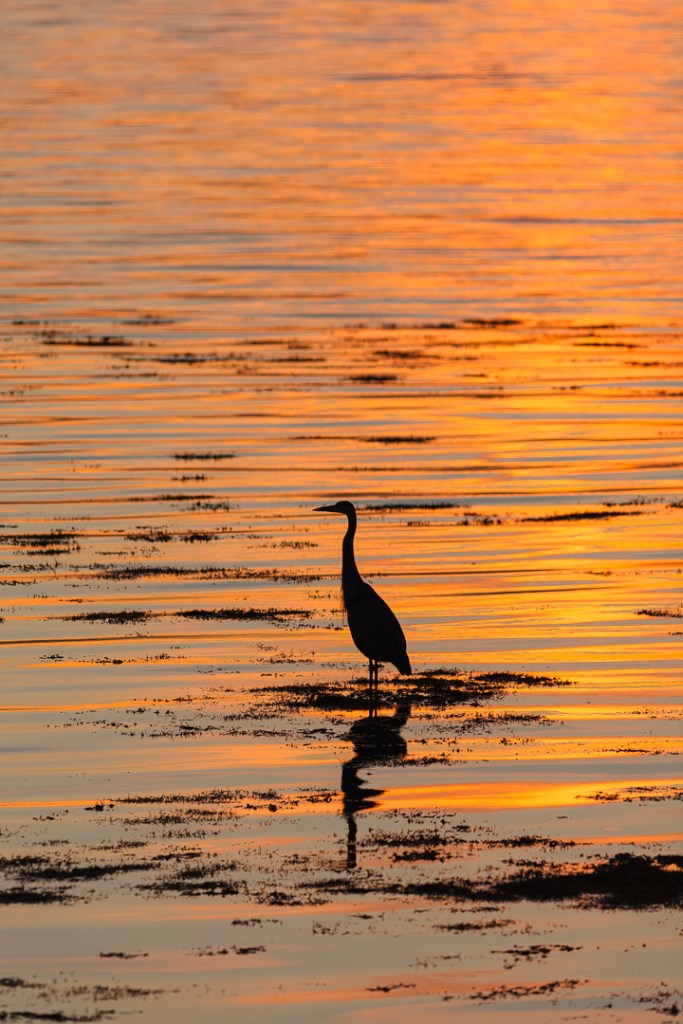 The image of the Great Blue Heron, is in silhouette due to the Golden Hour back light. It’s not always necessary to see detail in your subject as seen here you can still recognize the bird because of it’s shape which is also enhanced by the reflection in the water. The subject was placed in the bottom center to provide some symmetry for the golden water above and surrounding the bird.