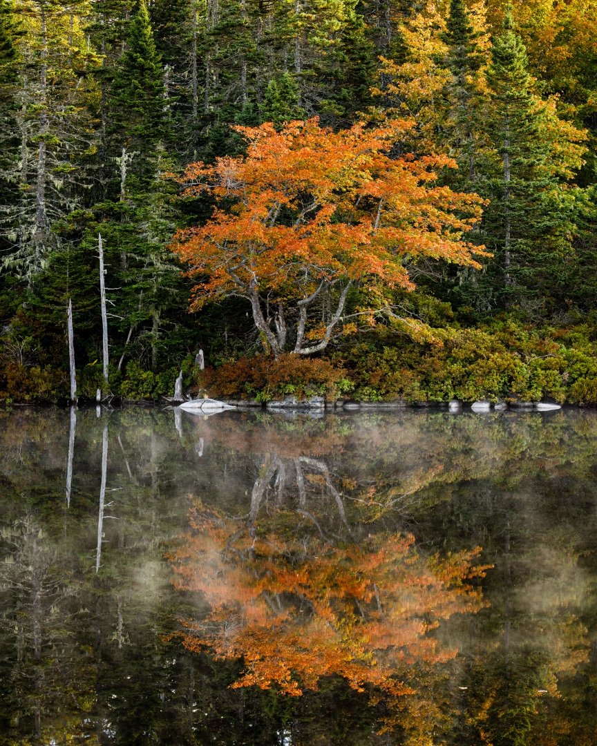 When shooting Fall Colour consider your shutter speed in relation to the amount of wind because the leaves move with the wind. In the images below you can see the water is calm providing reflections because there was not much wind, therefore your shutter speed can be a bit slower allowing for a lower ISO for a higher quality result.