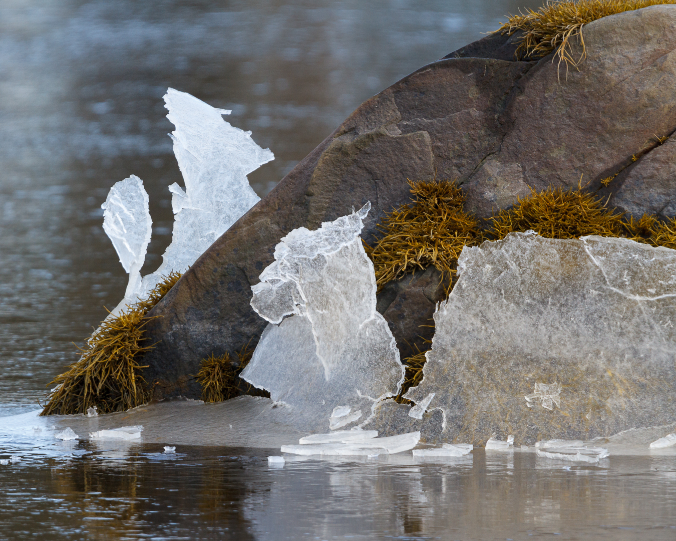 With ice it’s a matter of catching the right light and angle to make your images more interesting. Look for interesting conditions such as changes in water level which can cause ice to appear elevated or rocks that push the ice up creating interesting shapes.