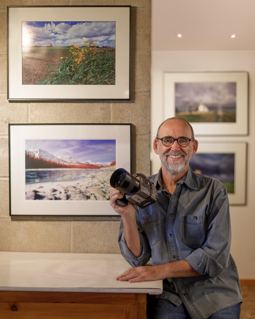 One of my photographer friends, Chris Stackhouse, agreed to have his environmental portrait taken as a prelude to being a guest on our podcast, which you can listen to on Episode #5, of the You Can Learn Photography Podcast. I decided to shoot the first image in his living room in front of some of his work using an 85mm f/1.8 lens while framing him within one of his corner displays. The light from the two large windows provided the rim light as well as enough ambient light for the photograph. The camera that he is proudly displaying is a medium format Hasselblad digital camera which he used to take many of his Grain Elevator, Landscape, and Seascape images. The second image below was taken in his studio with the same 85mm lens with two bounce flashes; one to light the subject and the other to light the background.