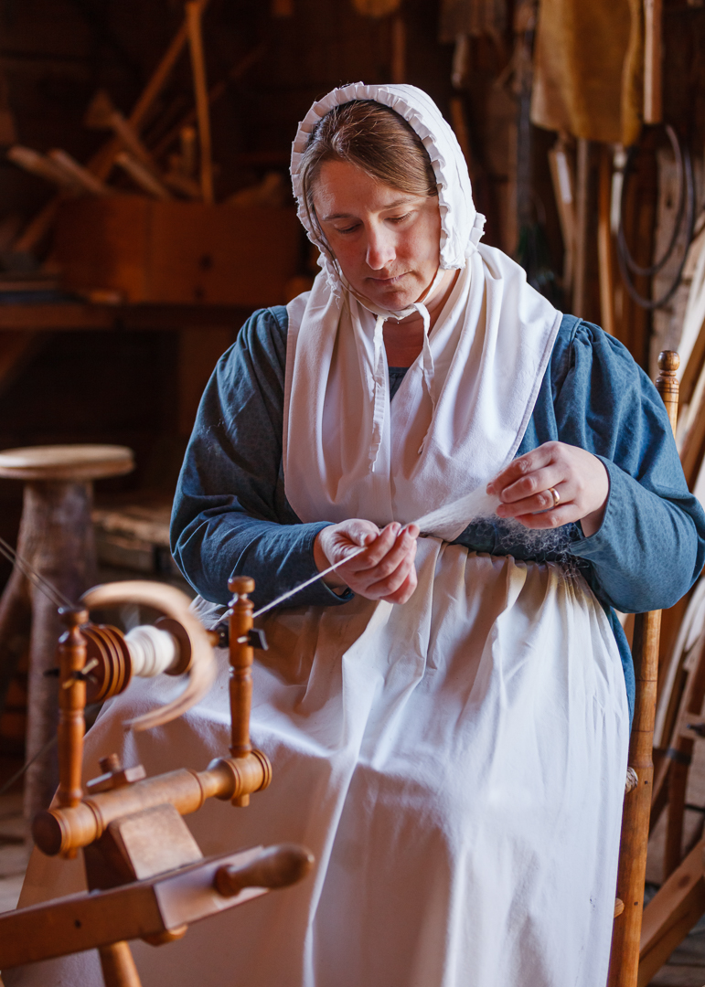 Another idea is to visit a local museum where they demonstrate activities such as at the Ross Farm Museum located in New Ross, Nova Scotia. This Museum is a living, working, farm depicting over 150 years of agriculture in Nova Scotia, which at various times of the year demonstrate how things were done on a farm in the early days living in Nova Scotia, Such as sheering sheep and making wool as shown in the images below. The first image showing how to sheer sheep was taken outside in harsh light, which has it’s challenges, however I moved around to find a position to best minimize the harsh shadows and have a somewhat clean background. the second image of making the wool was taken in a work shed using the natural light that was coming in from a large open door and a window, while also using a slower shutter speed to show the motion of the spinning machine.