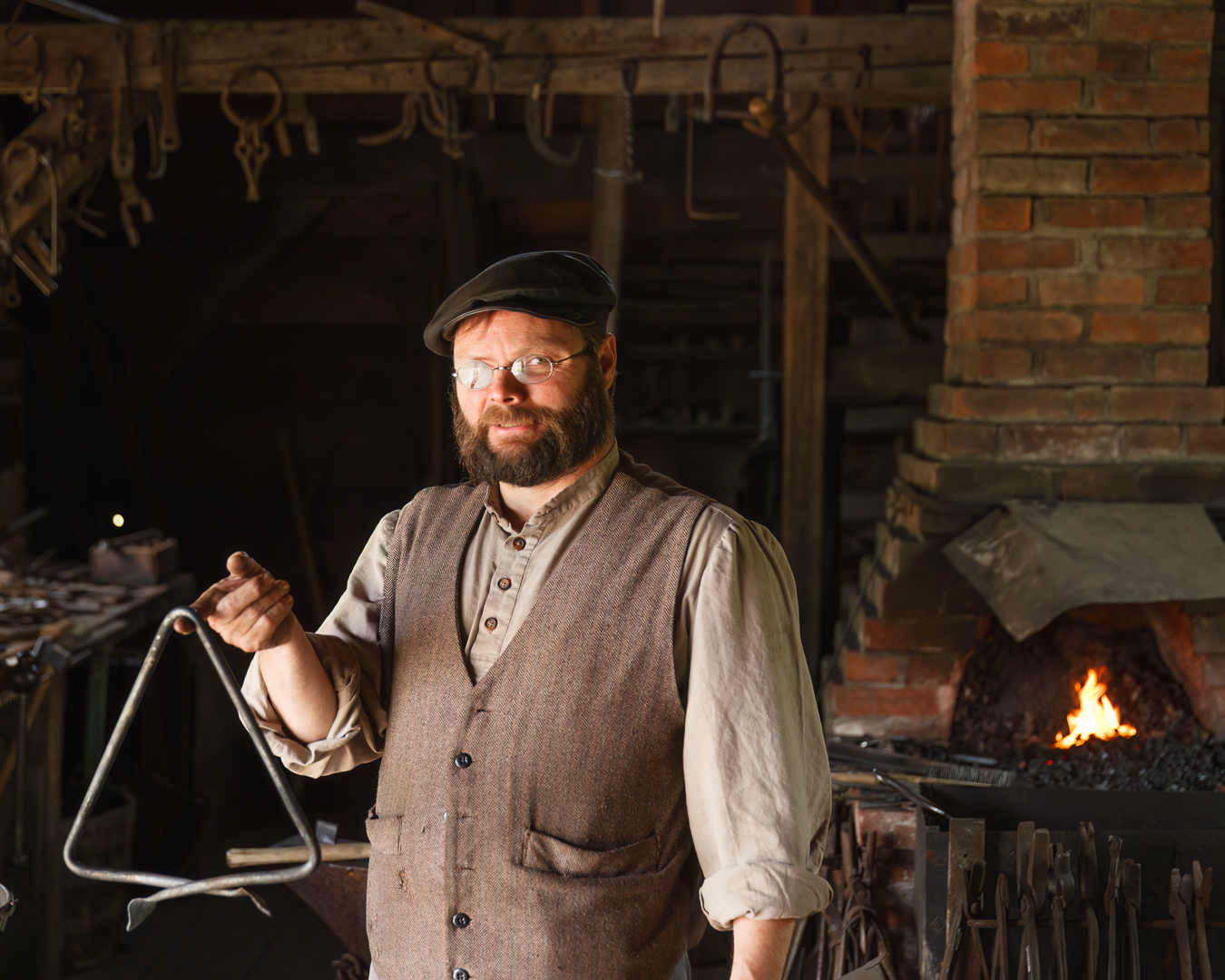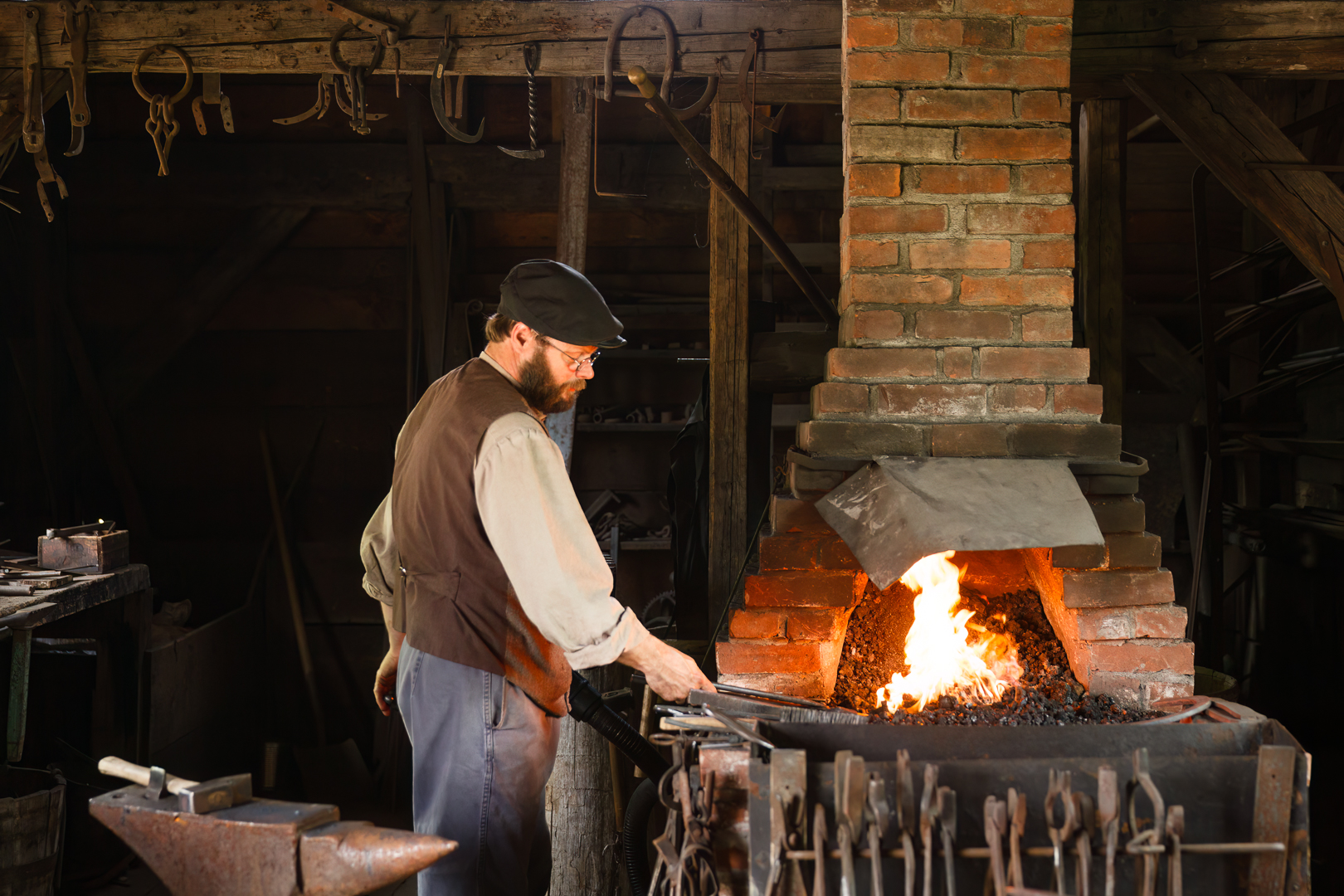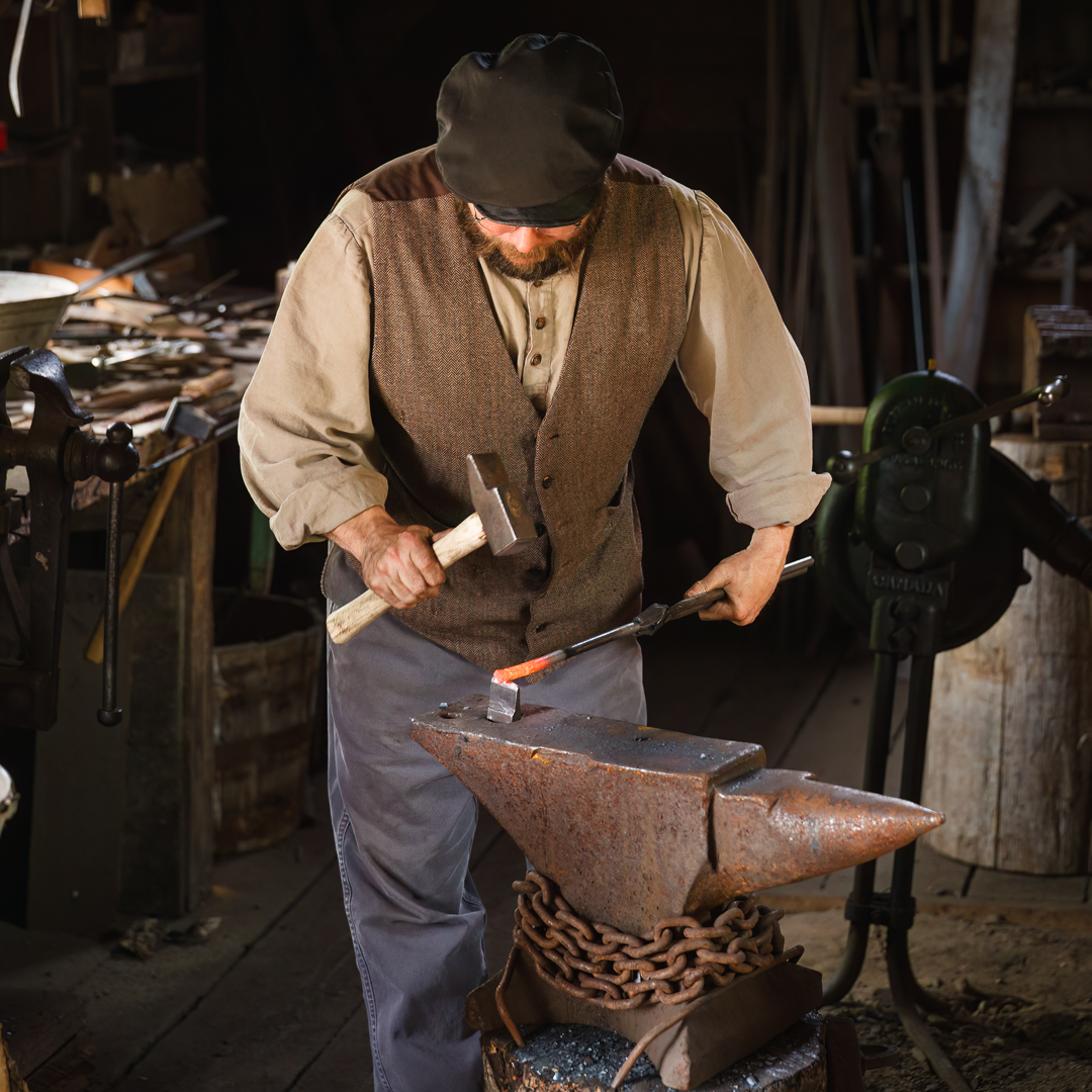 This was a great opportunity to take some environmental portraits. One tip is to think about creating a collection of images, don’t think about taking one image, make a “series of images” that as a whole help tell a more interesting or complete story. The light in a Blacksmith Shop is quite dark, so analyze the light and observe the Blacksmith to see how his face interacts with the available light. Keep in mind that these images may require some post editing to be able to increase the brightness of the shadows because you may have to overall under expose slightly to handle the dynamic range of the light from the flame and windows. This will also require a more open aperture, a smaller f stop number, and a higher ISO, therefore pay particular attention to focusing on your subjects eye and choose a shutter speed that helps tell the story as well. Notice in the closeup image of the Blacksmith hammering the metal, the hammer is blurred a bit to show motion, which is possible by choosing a suitable shutter speed.