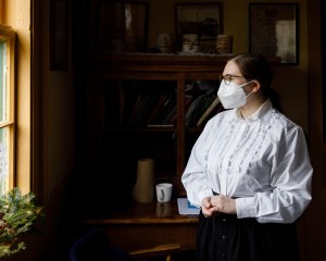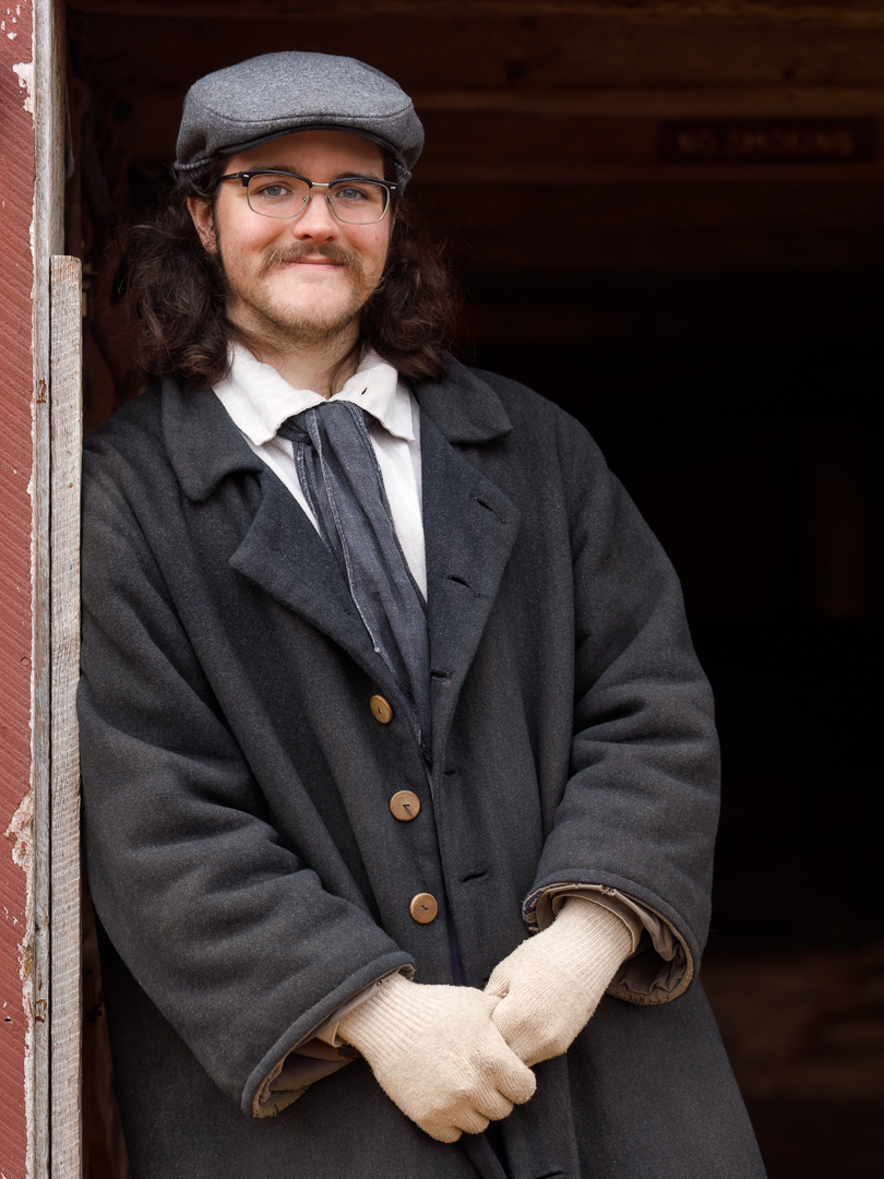 Here is an example of a volunteer acting as a school teacher at The Ross Farm Museum in New Ross Nova Scotia. It was slightly overcast outside so the window light was a bit soft, and in order to have the light even softer on the subject I asked her to move about 3 feet away from the window. I also got her to look out the window so the light would be even on her face to make it more flattering, and also asked her to pose, as well as her hands, as if she were thinking of something. As far as composition I included a bit of the window frame and had her stand to frame her in as best as possible within the book shelf in the background to help with the school teacher in the classroom story. I also made use of the fact that the room was dark to help make her stand out from the backgound. Note, I should have removed a few distractions; the white angel from the bookshelf at the top of her head, and the white paper by her left shoulder/arm, which is an example of things to be aware of, part of what is called perimeter patrol. The distractions can be removed in Photoshop with the result shown in the second image, but it’s always better to remove them to capture it in camera as best as possible..