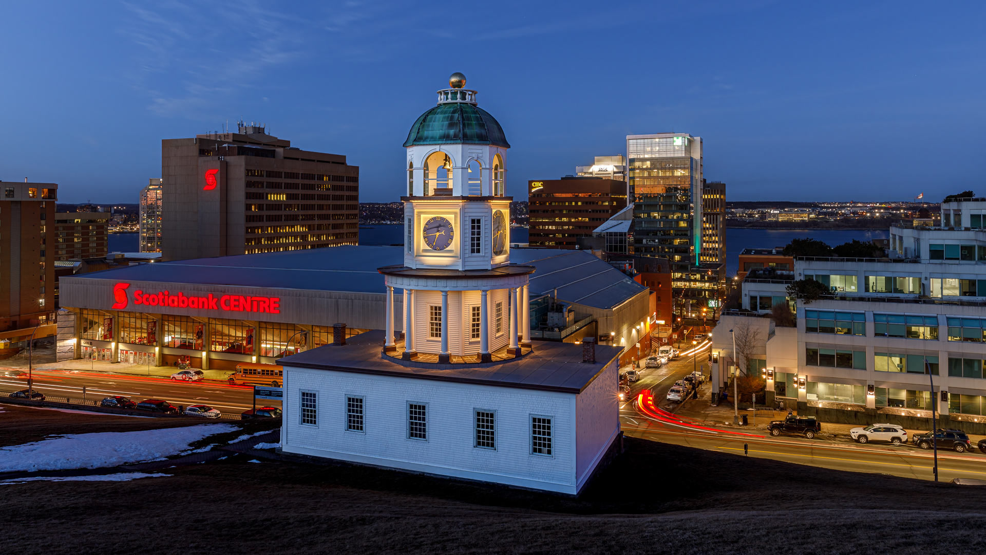 Halifax Town Clock; The Old Town Clock, Halifax Nova Scotia, is one of Halifax’s iconic locations. This clock was erected in 1803, survived the Halifax explosion of 1917, and had many restorations over the years, 1960, 1990, 2005, & 2018. To find out more take a look at the “Halifax Town Clock Wiki”. This image was taken during civil twilight to include the backdrop of some of the downtown of Halifax as well as the dramatic clouds in the sky and the light trails from the traffic.