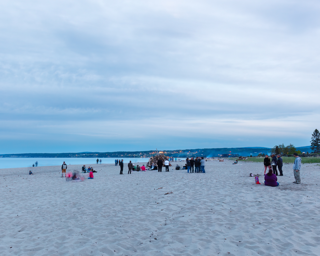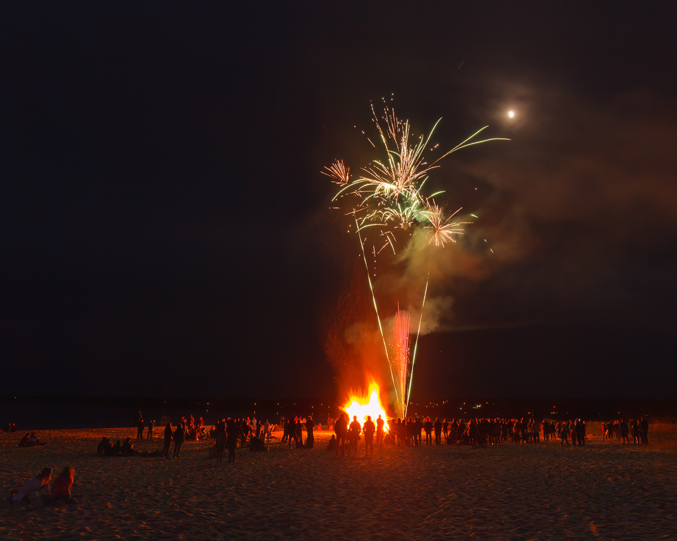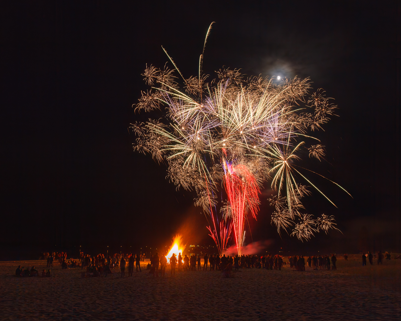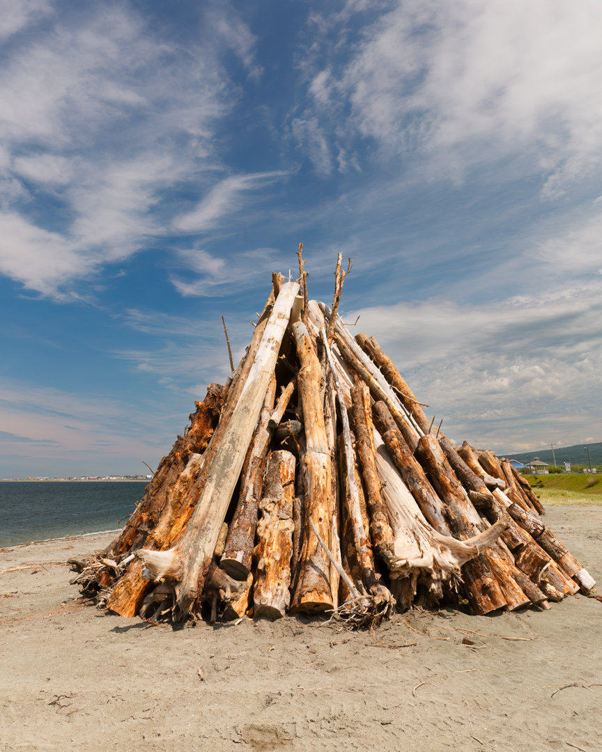 Gaspé Peninsula, Québec Canada: In 2018 during our trip around the Gaspé Peninsula to see the Northern Gannet bird colony on Bonaventure Island in Percé, We unexpectedly got to see a bonfire, the moon, and fireworks at Haldimand Beach near the town of Gaspé celebrating Saint-Jean-Baptiste Day (June 24th). The logs (drift-wood) for these large bonfires come from each respective local shoreline of the Gaspé Peninsula which are gathered by the locals and stacked using tractors with the final result shown in the image below at Cap-Chat Beach, Québec, with this one being approximately 15-20 feet high. The remaining three images were from Haldimand Beach just before the lighting of the bonfire and then during the fireworks. The moon and the bonfire are brighter than ideal, however within a single frame the dynamic range is too high for the camera to capture them with a better exposure, as the main subject is the fireworks we sacrificed the exposure of the bonfire and moon. Consider presenting a series of your photographs to tell the story.
