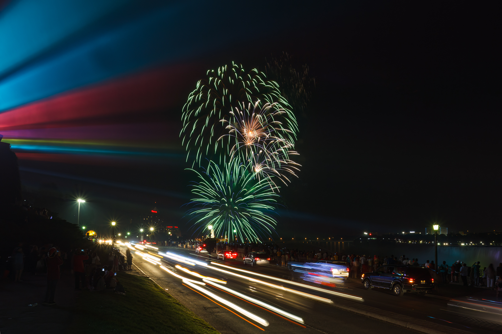 Niagara Falls, Ontario Canada: A number of years ago visiting Niagara Falls Canada we were lucky to experience the fireworks display during our stay. Niagara Tourism present the Summer Fireworks Series, See the Schedule, held daily from late May through early October sponsored by local hotels and the Niagara Parks Commission. This photo shows a fireworks burst, the lights that shine on the Canadian Horseshoe Falls, and the light trails of the vehicles passing by, showing more of the chaos of the busy activity during the fireworks show. Spend time prior to the event to get the best vantage point that works for you, using pre-visualization as a technique to help you decide.