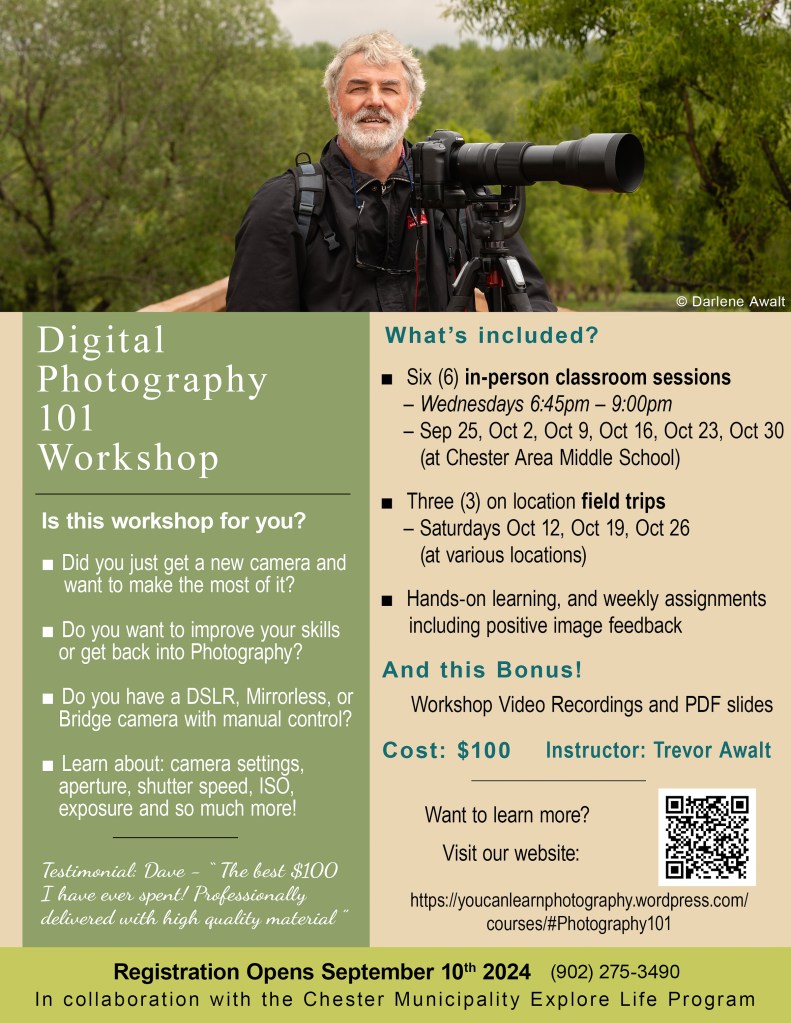 The “Digital Photography 101 Workshop” is offered through the Chester Municipality Recreation “Explore Life” Program Starting Sep 25th, 2024. You can Register between Sep 10th through 20th 2024 by calling Chester Recreation at (902) 275-3490.