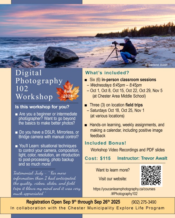 The Fall 2025 “Digital Photography 102 Workshop” is offered through the Chester Municipality Recreation “Explore Life” Program Starting Oct 1st, 2025. You can Register between Sep 9th through 26th 2025 (cost $115) by calling Chester Recreation at (902) 275-3490.