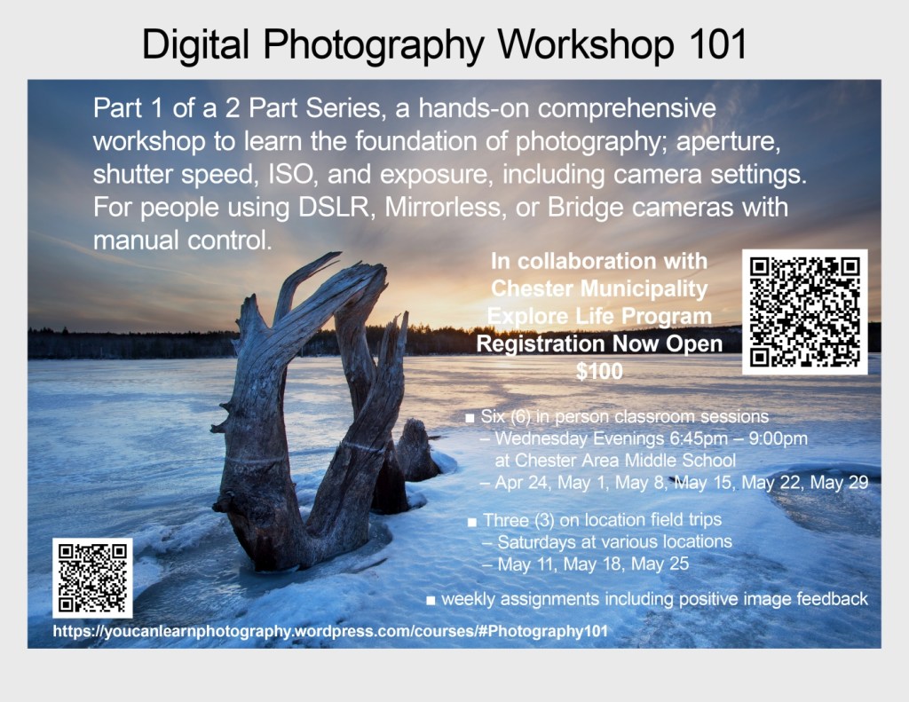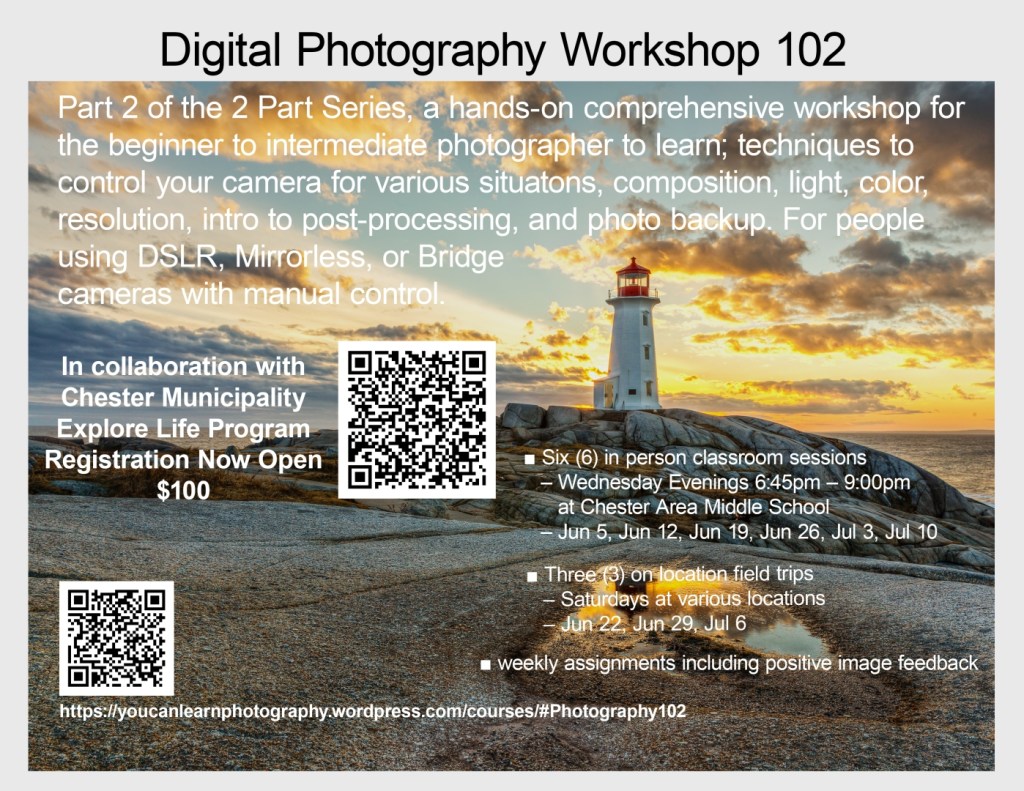 The “Digital Photography 101 Workshop” is offered through the Chester Municipality Recreation “Explore Life” Program Starting Sep 25th, 2024. You can Register between Sep 10th through 20th 2024 by calling Chester Recreation at (902) 275-3490.